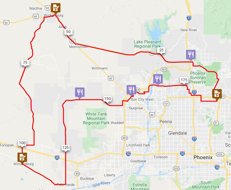 This is a route which stays predominantly in the far west valley. You will start by making your way across Phoenix on your way to the first control. Once you leave this control, you will be heading out into the wide open spaces of Arizona. There will be very little to slow you down for about the next 130 miles! There will be no climbs to worry about, but the desert can be unforgiving if you allow yourself to become dehydrated. You will ride through a couple areas where you will find civilization, but it will mostly be you, your bicycle, and the desert. Between miles 65-150, you will probably wonder why the roads were even built. I, too, wonder why. They seem to be roads to nowhere. Make sure you refuel at the few locations which are available. This segment will be on the namesake Vulture Mine Road. This is a hidden treasure. It is nearly deserted most of the time and will offer some nice views of the desert and some colorful formations near the Vulture Mine. When you reach Sun City, your desolation is over. You are now back in the metropolis. You'll find, though, that the roads are less trafficy than you'd expect. The last 50 miles are pancake flat and and should have a prevailing tailwind pushing you home. There's a whopping total of about 4,400 feet of climbing.