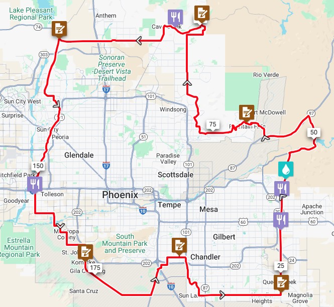 Services are located at regular intervals along the route. Towns and cities visited: Chandler, Queen Creek, Mesa, Fountain Hills, Scottsdale, Carefree, Cave Creek, Peoria, Estrella, Avondale, Laveen and possibly Phoenix somewhere in there!