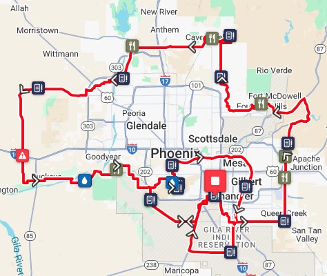 Services are located at regular intervals along the route. Towns and cities visited: Chandler, Queen Creek, Mesa, Fountain Hills, Scottsdale, Carefree, Cave Creek, Peoria, Sun Cities, Buckeye, Estrella, Avondale, Laveen and possibly Phoenix somewhere in there!