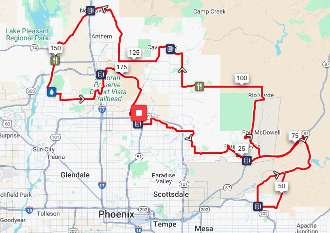This route will explore numerous nice cycling areas in the far North Phoenix valley. The climbing will be modest and none are particularly challenging. Areas visited on the 300k include: Phoenix Sonoran Preserve, Peoria Regional Preserve, Lake Pleasant, Cave Creek, Saguaro Lake and Usery Mountain Regional Park. It's a scenic route with not much to slow you down.