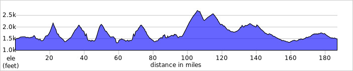 This route climbs roughly 7,600' total feet. All of the climbs are long, gradual and not particularly difficult.